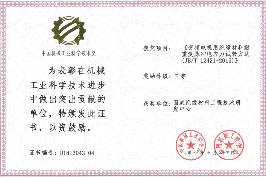 由中国机械工业联合会和中国机械工程学会共同设立“中国机械工业科学技术奖”,是中国机械领域最具权威的奖项之一。近日,2018年度中国机械工业科学技术奖获奖项目公布,我公司(国家绝缘材料工程技术研究中心)参与制定的行业标准JB/T12421-2015《变频电机用绝缘材料耐重复脉冲电应力试验方法》荣获 “中国机械工业科学技术奖” 三等奖。此次获奖说明公司一如既往的发挥着行业示范带头作用,争先拥有规则的话语权,为公司提高核心竞争力和产品创新能力提供了助力。